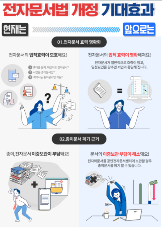 본 저작물은 ‘과학기술정보통신부’에서 ‘20년’ 작성하여 공공누리 제1유형으로 개방한 ‘전자문서 활성화 위한 '전자문서 및 전자거래 기본법' 개정(작성자:장민영 사무관)’을 이용하였으며, 해당 저작물은 ‘과학기술정보통신부 홈페이지’에서 무료로 다운받으실 수 있습니다.