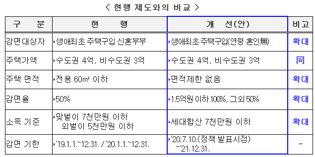 - 현행 신혼부부 대상 감면 제도는 맞벌이 7천만 원, 외벌이 5천만 원을 기준으로 하는 데 비해, 맞벌이 여부를 구분하지 않아 감면 적용 범위를 확대했다.