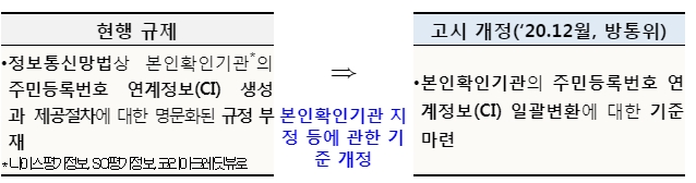 정보통신망법상 본인확인기관의 주민등록번호 연계정보(CI) 생성과 제공절차에 대한 규정이 부재*하여 모바일 전자고지 서비스를 제공하는데 어려움이 있었다.