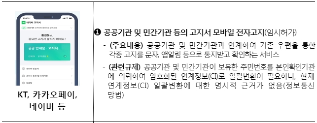 현재 ICT 규제 샌드박스를 통해 다양한 기관에서 모바일 전자고지 서비스를 제공 중에 있으며, 「본인확인기관 지정등에 관한 기준을 개정하여 기존 우편을 통한 각종 고지서를 모바일로 통지하는 것이 가능하도록 제도개선을 할 예정이다.