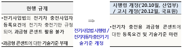 기존 콘센트를 활용한 전기차 충전서비스가 확대될 수 있도록 전기사업법 시행령 및 관련 고시를 개정할 계획이다.
