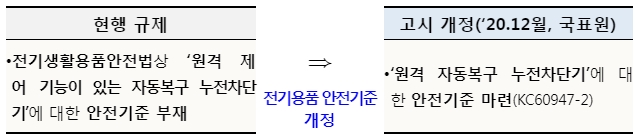현재 규제특례를 부여받은 사업자가 시장에서 제품 실증을 진행중에 있으며, 실증결과를 검토하여 앞으로 현장출동 없이도 원격으로 점검하고 복구할 수 있는 시스템 구축이 가능하도록 전기용품 안전기준」개정 작업이 진행 중이다.