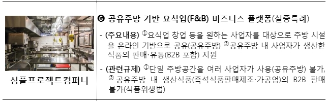 공유주방을 통해 신규 요식업 창업자들의 초기비용 부담을 줄여 새로운 일자리 창출이 기대되는 만큼, 실증 진행 경과를 검토하여 공유주방에 대한 법적 기준을 마련할 계획이다.