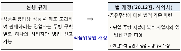 식품을 조리하여 판매하려는 영업자는 주방 구획별로 하나의 사업자만 영업신고가 가능하여 동일 주방을 여러 사업자가 공유하는 창업은 불가능 하였다.