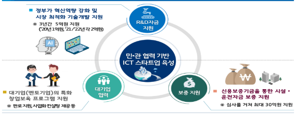 ㅇ 정부와 대기업이 ICT 기술창업 기업을 공동으로 발굴하고, 고성장기업으로 도약할 수 있도록 민·관이 협력하여 성장 전주기 지원