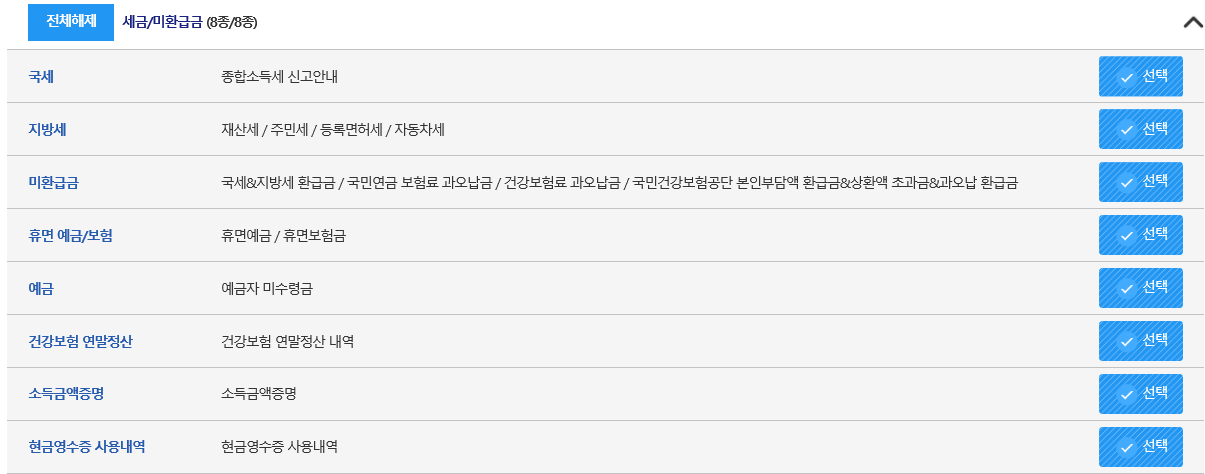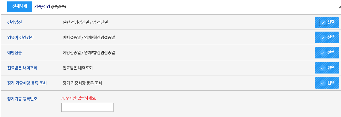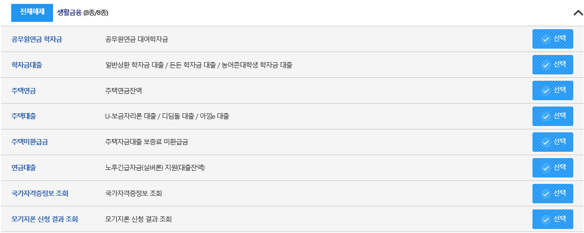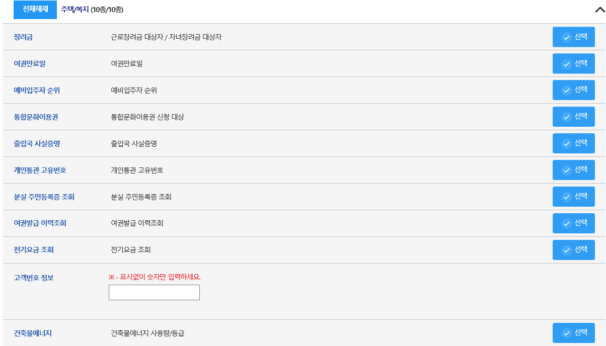 - 저는 전체 선택 후 확인을 눌렀습니다. 그리고 중간중간에, 예를 들면, 자동차 번호, 전기 납부 번호 등 입력하는 부분이 나오는데, 알고 계시면 입력하시고, 모르시면 선택을 지우시면 됩니다. 그러고 나서 바로 확인~~~