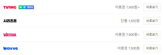 아래의 스트리밍 플랫폼 들은 모두 유료이며 티빙, 왓츠, 웨이브는 7,900원부터 그리고 시리즈온은 단품으로 시청이 가능합니다.