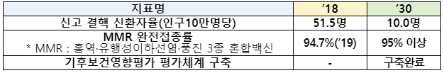 * 인구 10만 명당 손상 사망률(’18년 54.7명/목표치 56명), 출생아 1천 명 당 영아사망률(’18년 2.8명/목표치 2.8명)