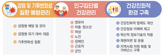 제5차 국민건강증진 종합계획(’21~’30년)’은 총 6개 분과에 걸친 28개 중점 과제를 마련하였습니다.