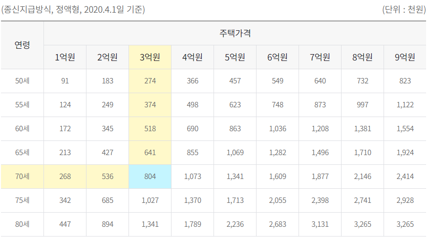 *예시 : 70(부부 중 연소자 기준), 3억원 주택 기준으로 매월 804천원을 수령합니다.