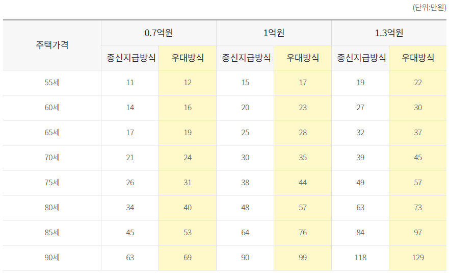 * 우대방식의 월지급금은 1.5억원을 기준으로 한 종신지급방식의 월지급금을 초과할 수 없음