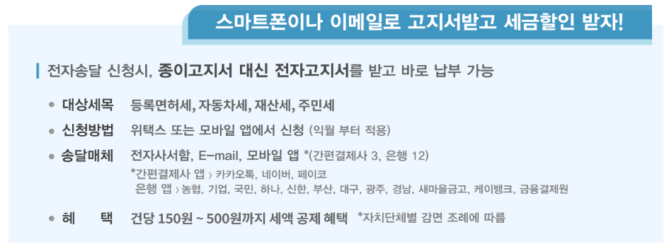 모든 지방세(자동차세, 재산세 등)를 이체수수료 없이 편리하게 납부 가능한 서비스