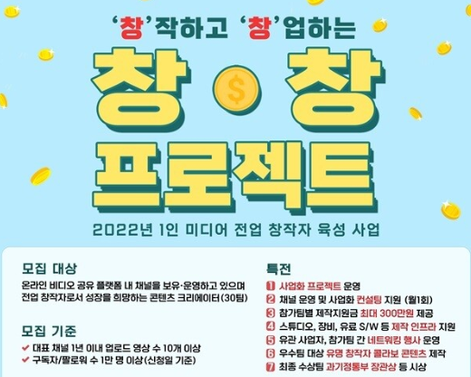 창창 프로젝트는 과학기술정보통신부에서 주관하며, 국내 중소 1인 미디어(유튜브 등) 크리에이터를 전업 창작자로 집중 육성하기 위해 컨설팅 그리고 자금등을 지원합니다.