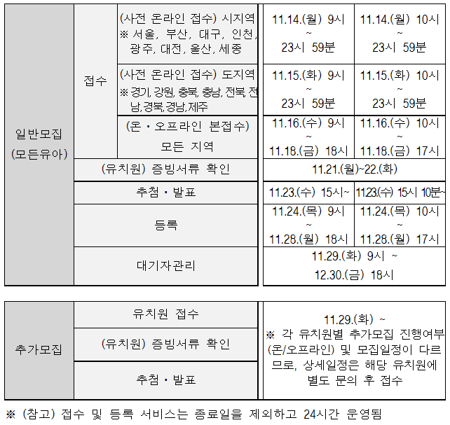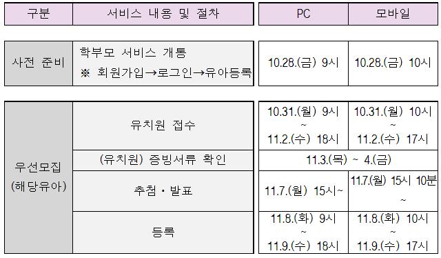 10월 28일(금) 9시부터 학부모 서비스를 통하여 회원 가입과 유아정보를 사전에 등록하고, 10월 31일(월)부터 시작되는 모집 유형별로 희망하는 유치원 3개까지 접수할 수 있습니다.