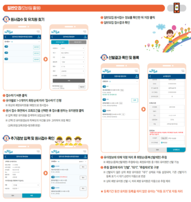 - 우선모집은 해당 자격 조건이 충족되어야 하고, 일반모집은 사전 접수와 본 접수 기가에 맞춰 유치원에 접수할 수 있습니다. 특히 '일반모집' 선발은 중복 선발이 제한되므로 1희망 유치원을 신중하게 선택해야 합니다.