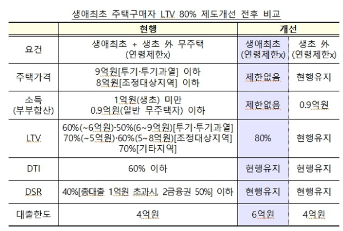 -> 생애최초 주택구매자 주택담보대출 LTV 80% 제도개선 전후 비교표