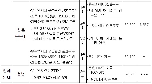 * 청년, 신혼부부 매입임대주택 신청자격, 입주순위는 아래의 표를 참고하시기 바랍니다.