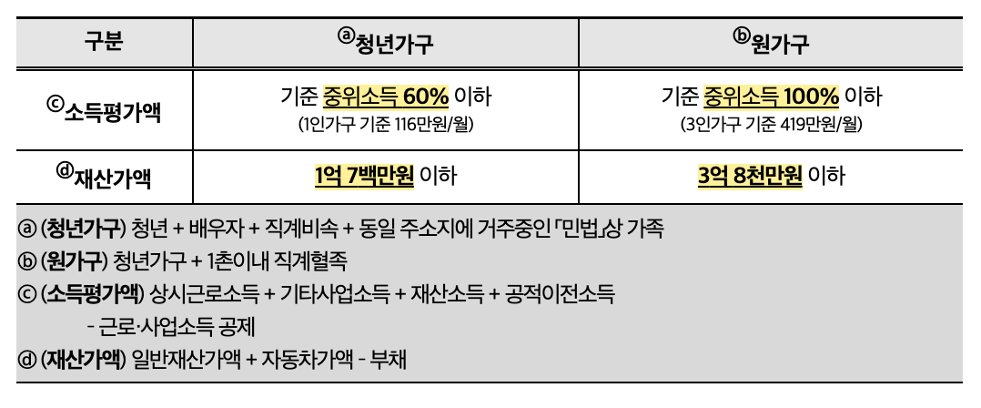 -> 청년가구 및 원가구의 소득, 재산 요건