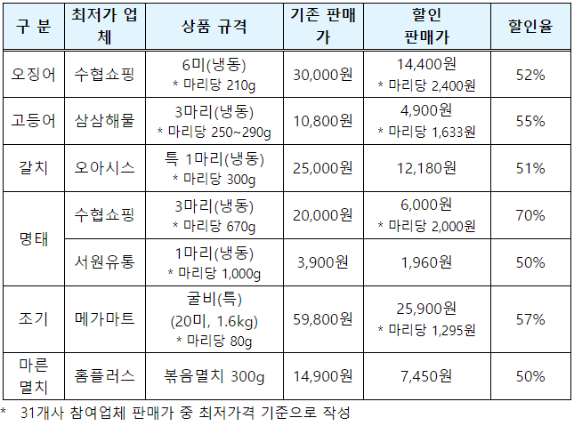 ㅇ 품목별 최저가를 보면, 냉동오징어는 6마리 14,400원(52% 할인), 냉동고등어는 3마리 4,900원(65% 할인), 냉동갈치는 1마리 12,180원(51% 할인), 조기(굴비)는 20마리 25,900원(57% 할인), 볶음용 마른멸치는 7,450원(50% 할인)으로 판매될 예정이다. 특히 명태의 경우 수협쇼핑은 정상가 대비 70% 특별 할인행사를 진행하여 마리당 2,000원에 판매할 예정이다.