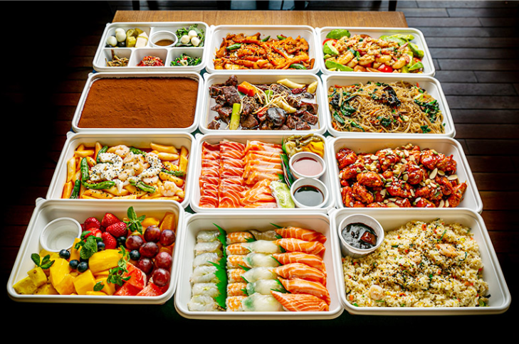 - 모듬초밥, 육회, 소불고기, 중식볶음밥, 새우아보카도샐러드, 모듬과일, 닭강정, 더덕제육볶음, 궁중잡채, 단호박무스, 티라미수, 마늘오리볶음, 돼지고기김치찜, 새우장, 해물떡볶이 구성입니다.