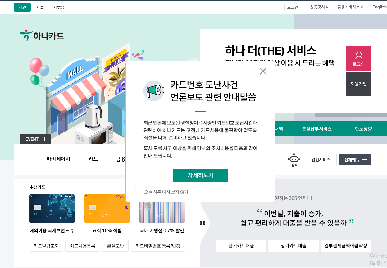 하나카드 홈페이지에 들어가 봤습니다.