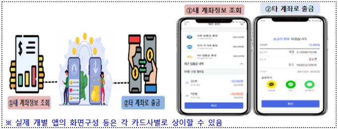 1. ‘21.5.31일부터 카드사도 오픈뱅킹에 참여하여 주요 카드사 앱에서도 오픈뱅킹에 참여하는 금융회사들의 본인 계좌를 조회하고, 타 금융사 계좌로 출금을 할 수 있게 됩니다.