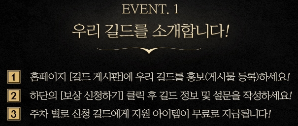 2020년 6월 15일(월) ~ 8월 10일(월) 23:59분까지 진행하는 길드 지원 대작전 이벤트에 참여하시고 길드 지원 아이템도 받아 가세요!