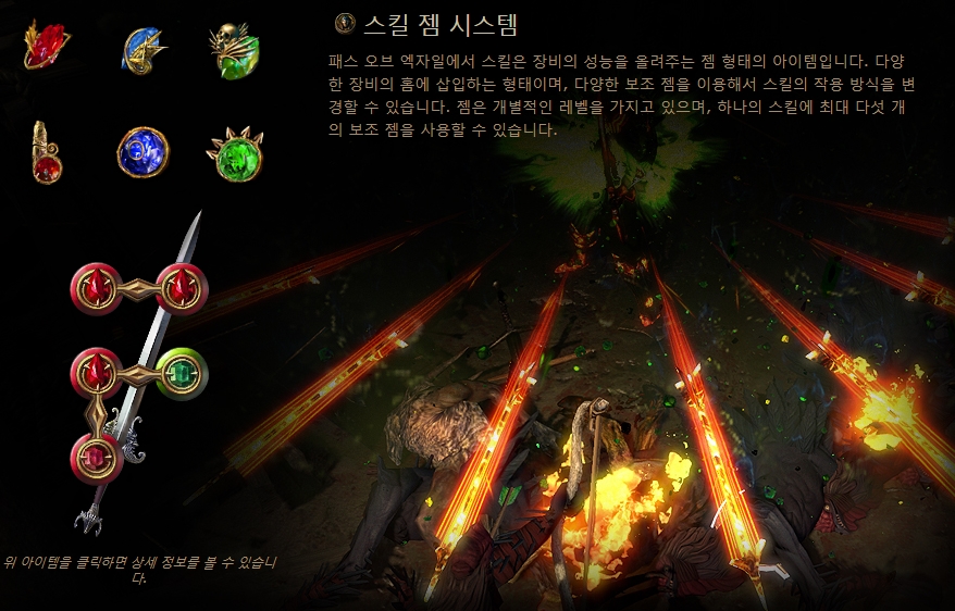 패스 오브 엑자일에서 스킬은 장비의 성능을 올려주는 젬 형태의 아이템입니다. 다양한 장비의 홈에 삽입하는 형태이며, 다양한 보조 젬을 이용해서 스킬의 작용 방식을 변경할 수 있습니다. 젬은 개별적인 레벨을 가지고 있으며, 하나의 스킬에 최대 다섯 개의 보조 젬을 사용할 수 있습니다.