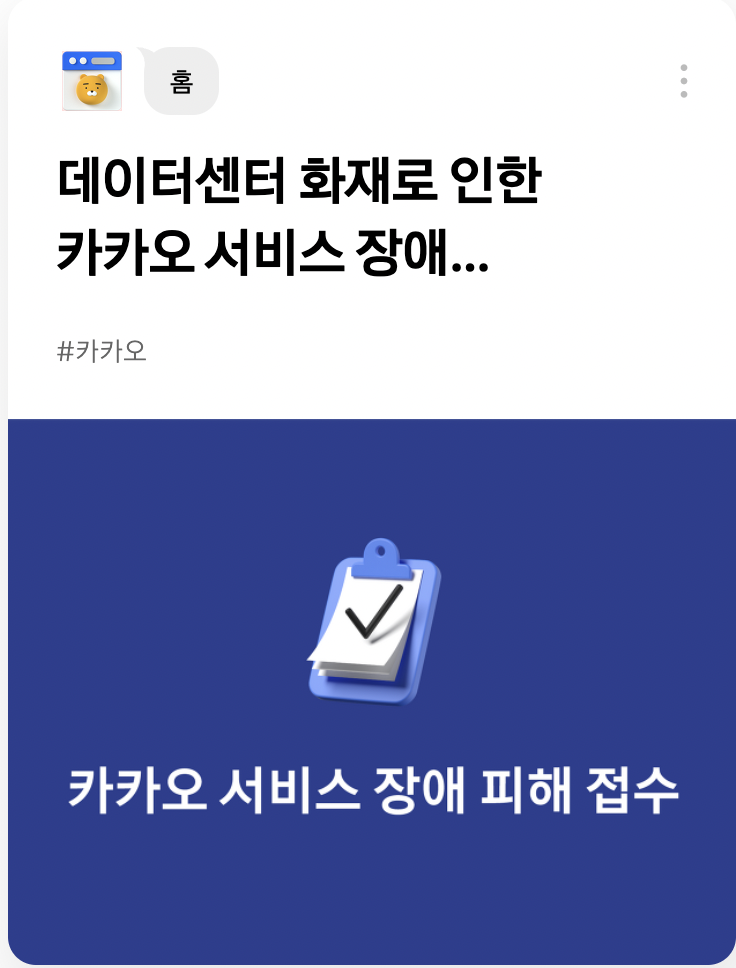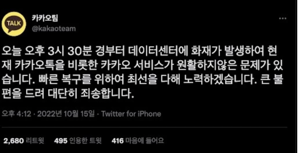 카카오의 데이터센터가 입주해 있는 SK C&C 건물이 화재가 남으로 모든 카카오 서비스들이 먹통이 되는 사건이 일어났습니다.
