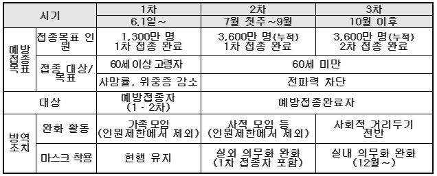 코로나 예방접종 계획상 주요 분기점인 7월과 10월을 중심으로 방역조치 조정대상 및 활동을 구분하여 단계적으로 실시한다고 합니다.