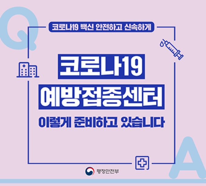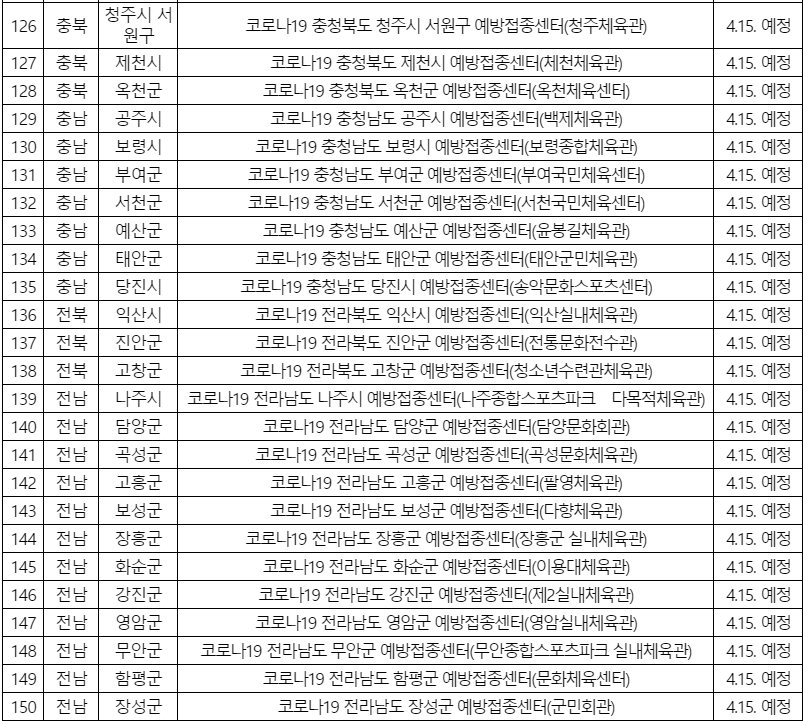 본 저작물은 ‘질병관리청’에서 ‘21년’ 작성하여 공공누리 제1유형으로 개방한 ‘4월 모든 시·군·구에 예방접종센터 설치ㆍ운영(작성자:코로나19 예방접종대응추진단 접종시행3팀)’을 이용하였으며, 해당 저작물은 ‘질병관리청 홈페이지(www.cdc.go.kr/cdc/)’에서 무료로 다운받으실 수 있습니다.