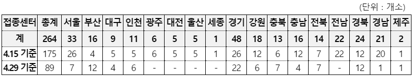 * 예방접종센터 운영현황 : (4.1) 49개 →(4.8) 71개 → (4.15) 175개 → (4.29) 264개