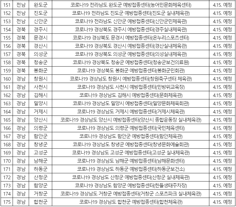 코로나19 예방접종대응추진단은 어르신들의 예방접종센터 접근성 제고와 신속한 코로나 예방접종을 위해 4월 말까지 전국 264개 코로나 예방접종센터(전국 250개 행정구에 1개소 이상)를 설치·운영할 예정이기 때문입니다.