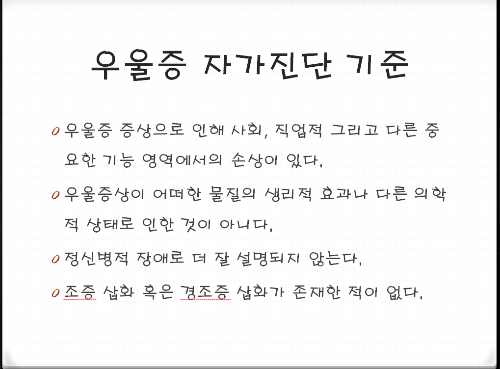 1. 다음 증상 가운데 5개(또는 그 이상) 증상이 연속 2주 기간 동안 지속되며, 이러한 상태가 이전 기분으로부터 변화를 나타내는 경우에 자신이 우울증 증상을 나타내고 있다고 생각해 볼 수 있습니다.