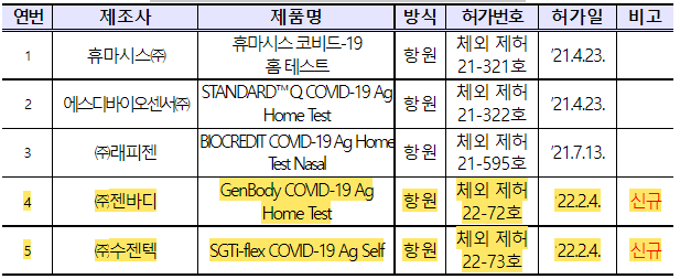 □ 식품의약품안전처(김강립 처장)는 개인이 직접 코(비강)에서 검체를 채취하여 바이러스 감염 여부를 확인하는 항원검사 방식의 코로나19 자가검사키트 2개사(社) 2개 제품을 2월 4일 허가했습니다.