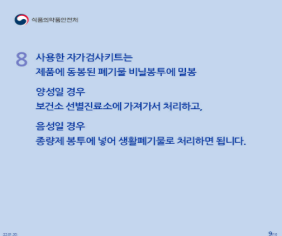 8. 사용한 코로나 자가검사키트는 제품에 동봉된 폐기물 비닐봉투에 밀봉하고, 양성일 경우 보건소 선별진료소에 가져가서 처리하고, 음성일 경우에는 종량제 봉투에 넣어 생활폐기물로 처리하면 됩니다.