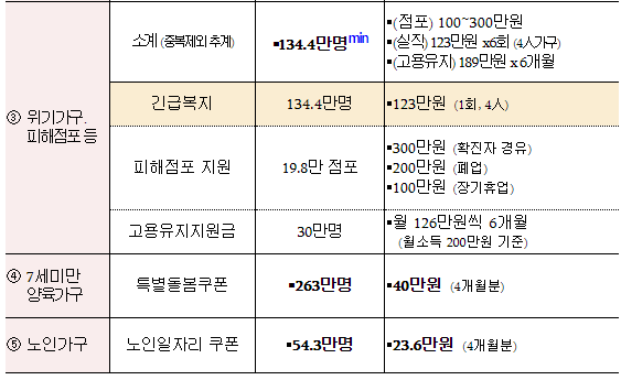 * (피해점포 지원) 100~300만원, 19.8만 점포(+0.3조) / (일안자금) 인당 4~7만원 추가, 60만업체(+0.5조) / (고용유지지원금) 월126만원(소득 200기준) x 6개월, 30만명(+0.5조)
