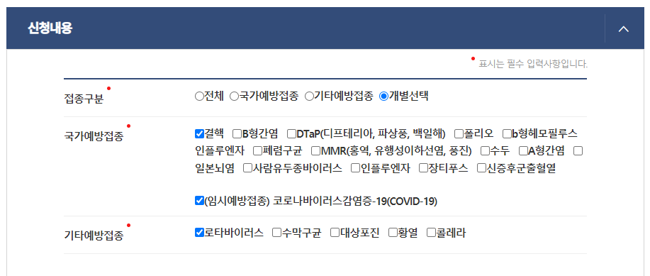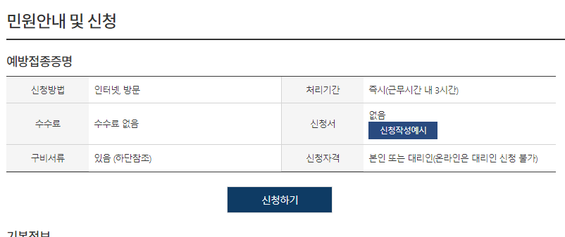 - 다음 페이지에 "예방접종 증명서" 신청 기본정보 입력란이 나타납니다.