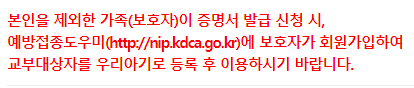 => "본인을 제외한 가족(보호자)이 증명서 발급 신청시, 예방접종도우미에 보호자가 회원가입하여 교부대상자를 우리아기로 등록 후 이용하시기 바랍니다."