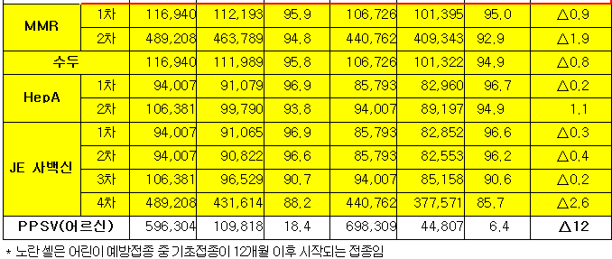 - 생후 12개월 처음 시작하는 예방접종률과 만 4~6세 추가 예방접종률은 2~3%p 감소
