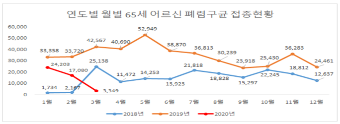 □ 2018~2020 1분기 연도별, 월별 어르신 폐렴구균 접종 현황