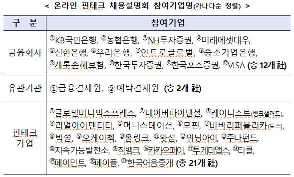 ※ 채용진행 기업 : 머니스테이션, 빅쏠, 오케이첵, 올링크, 위닝아이, 주나펀드, 지속가능발전소, 직뱅크, 투게더앱스, 페이플, 한국어음중개