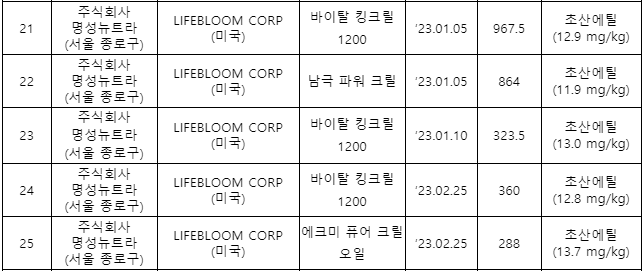 □ 식품의약품안전처(처장 이의경)는 국내 유통 중인 크릴오일 제품 총 140개를 수거해 검사한 결과, 49개 제품에서 항산화제인 에톡시퀸과 헥산 등 추출용매가 기준을 초과해 검출됐다고 밝혔습니다.