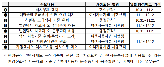 이에 대한 후속조치로, 행정규칙 개정안에 대해 10월 31일(월)~11월 21일(월)까지 행정예고하고, [여객자동차 운수사업법 시행령 및 시행규칙] 개정안은 11월 1일(화)~12월 12일(월)까지 입법예고한다고 전했습니다.