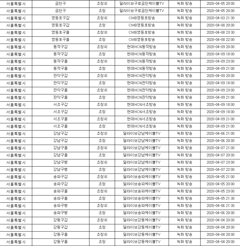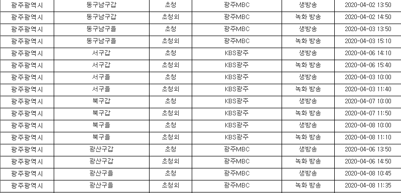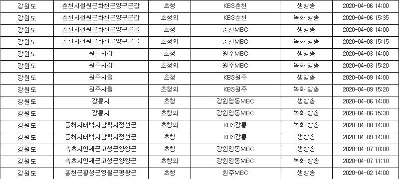 ※ 제21대 지역구 국회의원 선거 후보자 토론회 일정표는 '시도명' '선거구명' '초청대상' '중계 방송사 명' ' 중계방법' '방송일시' 순으로 정리되어 있습니다.
