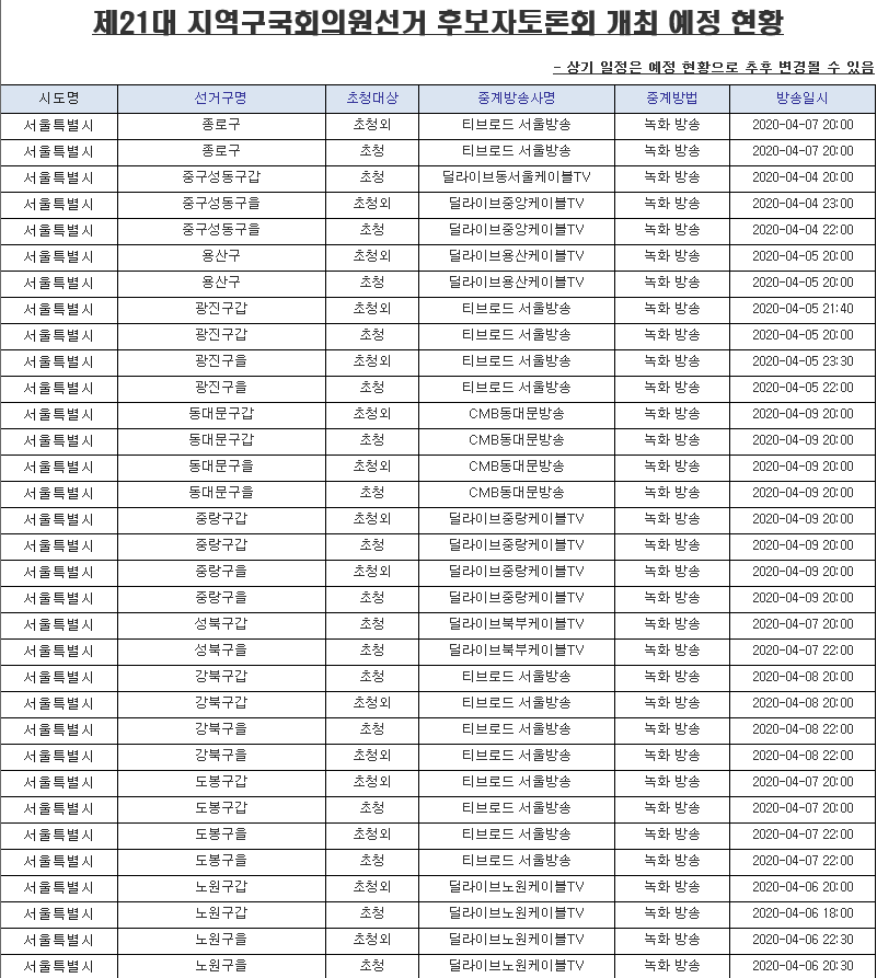 1. 서울특별시 제21대 지역구 국회의원 선거 후보자 토론회 일정