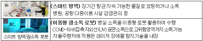 ㅇ (일상 생활방역) 업무시설, 공항, 항만, 항공기, 열차, 대중교통 등 밀접접촉시설의 상시방역을 위한 스마트 방역 시스템* 개발