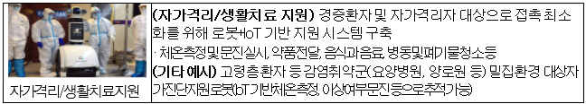ㅇ (지원내용) 로봇·ICT를 융합한 집중의료현장 관리, 생활치료시설 지원, 상시적 생활방역 확대에 필요한 융합기술 개발 및 현장실증 수행