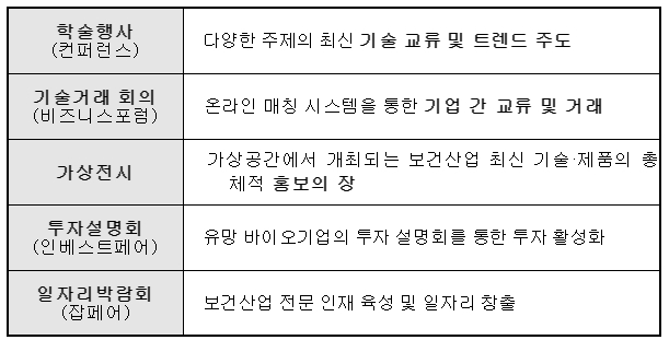 ○ 우리나라 보건(바이오헬스)산업의 기술 수준을 세계에 널리 알리고, 기업 간 상호 협력‧투자를 촉진하여 보건산업 위상을 제고