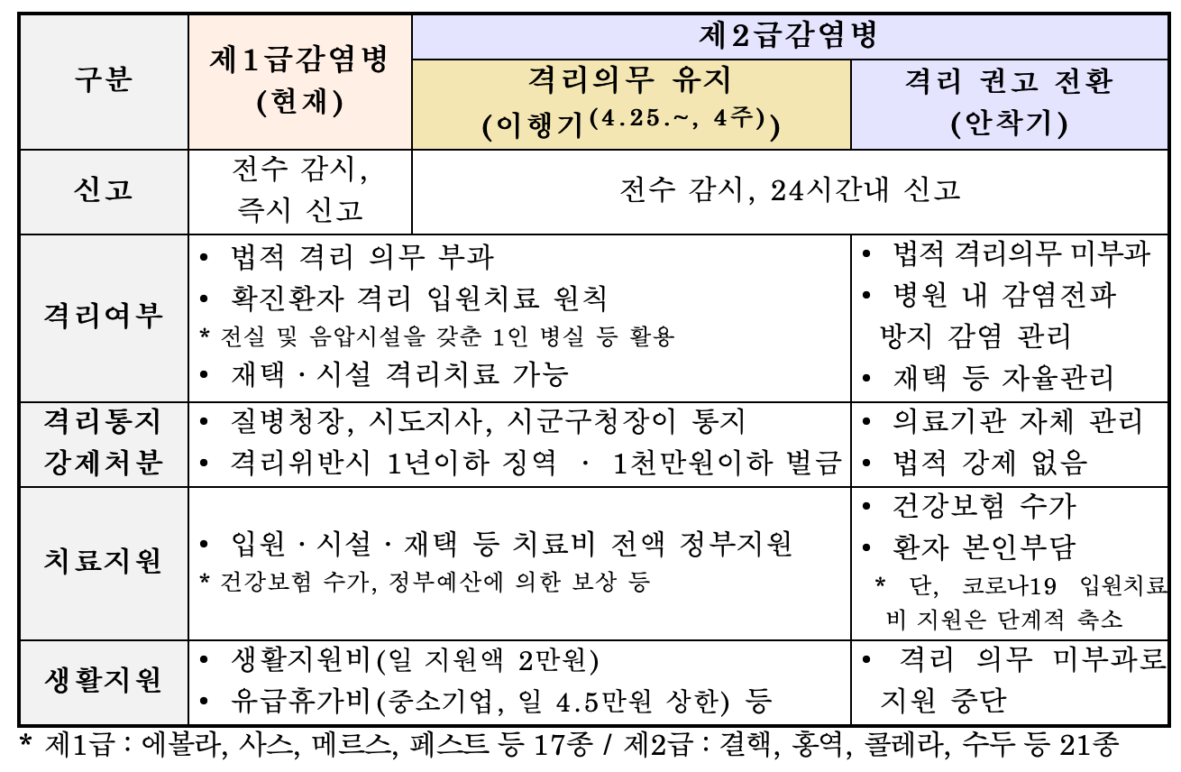 - 높은 백신 접종률과 먹는 치료제 보급 등 코로나19 발생 초기와 비교하여 강화된 대응 수단과, 오미크론 변이 이후 완화된 방역조치를 반영하여 감염병 등급을 1급에서 2급으로 조정합니다.